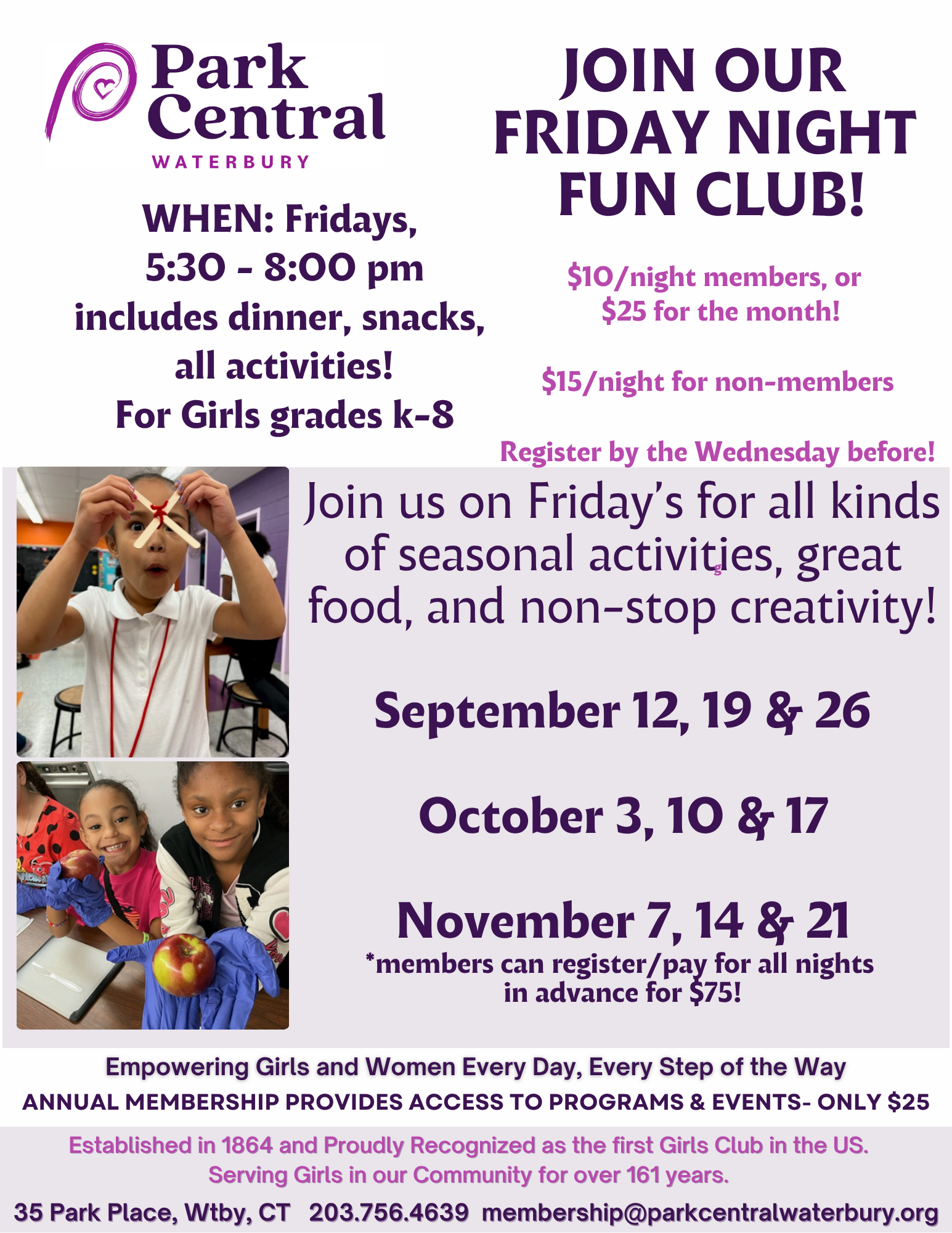 For girls of all ages, we offer Friday Night Fun that kicks off the weekend off with excitement! This program is all about friendship and fun – from creative crafts that inspire imagination, to exhilarating games that get the laughter going. The goal of our team is to fill every Friday night with unforgettable experiences that the girls will enjoy now, and talk about for days! Whether it's engaging in friendly competitions or getting involved in new experiences, you don’t want to miss Friday Night Fun. Grab your friends and enjoy something great to look forward to each week!
